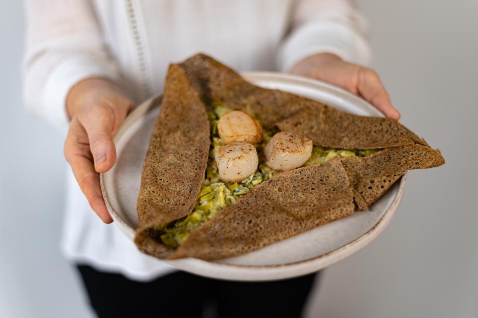 - Crêpes blé noir, fondue de poireaux au curry et Saint-Jacques, où le poireau devient un ingrédient central, fondant et aromatique.