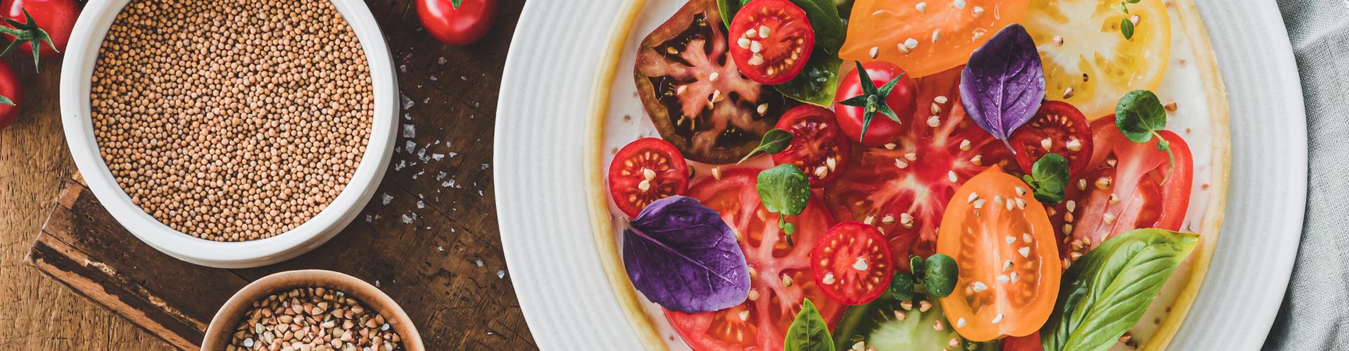 Dressez la tarte juste avant la dégustation. Garnissez la tarte de fromage frais parfumé aux graines de moutarde. Détaillez 3/4 tomates saveur d’antan en rondelles (selon la taille de votre plat à tarte) et quelques tomates cerises grappes détaillées en deux. Répartissez harmonieusement les rondelles et demi-tomates sur le fromage frais. Parsemez de graines de sarrasin torréfiées et d’herbes fraîches.